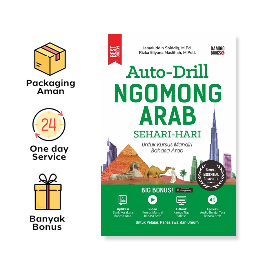 Setiap bab dilengkapi dengan pembahasan kaidah bahasa Arab juga terbentuk dan tidak sekedar menghafalan. Dengan metode yang terfokus dan berulang-ulang seperti ini, kebiasaan ngomong Arab akan terbentuk secara otomatis. Selamat berlatih!"