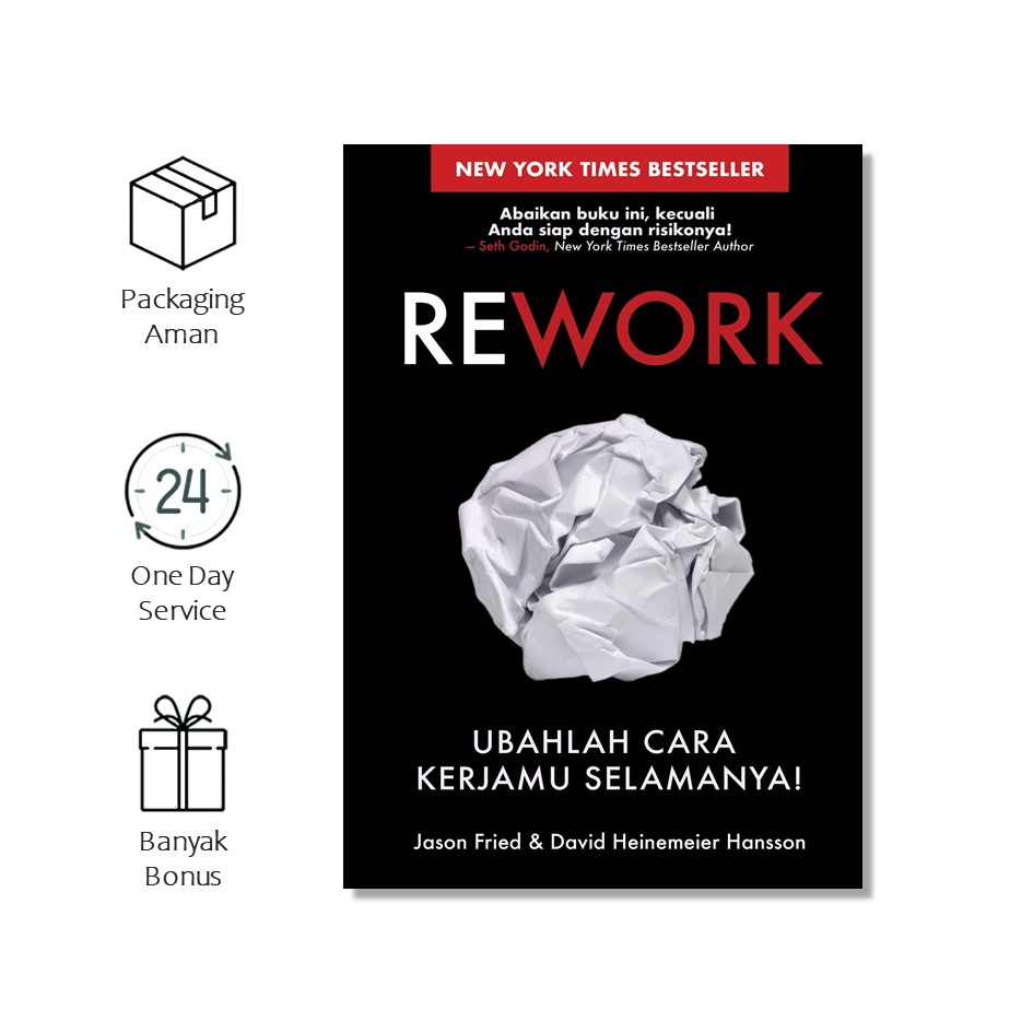 Dengan bahasanya yang lugas dan pendekatan easy-is-better, Rework merupakan pedoman sempurna bagi siapa saja yang pernah bermimpi untuk membangun perusahaan sendiri. Yang perlu Anda lakukan hanyalah berhenti bicara dan mulai bekerja!