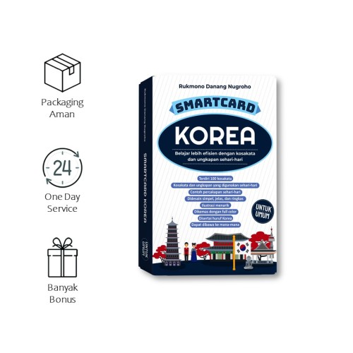 "Kamu ingin lancar bahasa asing? Tetapi binggung mau mulai dari mana? Smartcard ini bisa jadi solusi terbaik, lho. kok bisa? karena, - Terdiri atas 100 kosakata - Kosakata dan ungkapan yang digunakan Sehari-hari - Contoh perckapan sehari-hari - desain simpel, jelas, dan ringkas - Ilustrasi menarik dna dikemas dengan full color, disertai huruf korea, dan dapat dibawa kemana-mana Sehingga Pembaca akan lebih efisien dan tepat dalam memperlajari bahasa asing. Smartcard ini bertujuan agar pembaca diharapkan mampu mengaplikasikan dengan sederhana, seperti salam, berkenalan, bertanya informasi pribadi, bertanya lokasi dan benda, berbelanja, berhitung, memesan makanan, dsb."