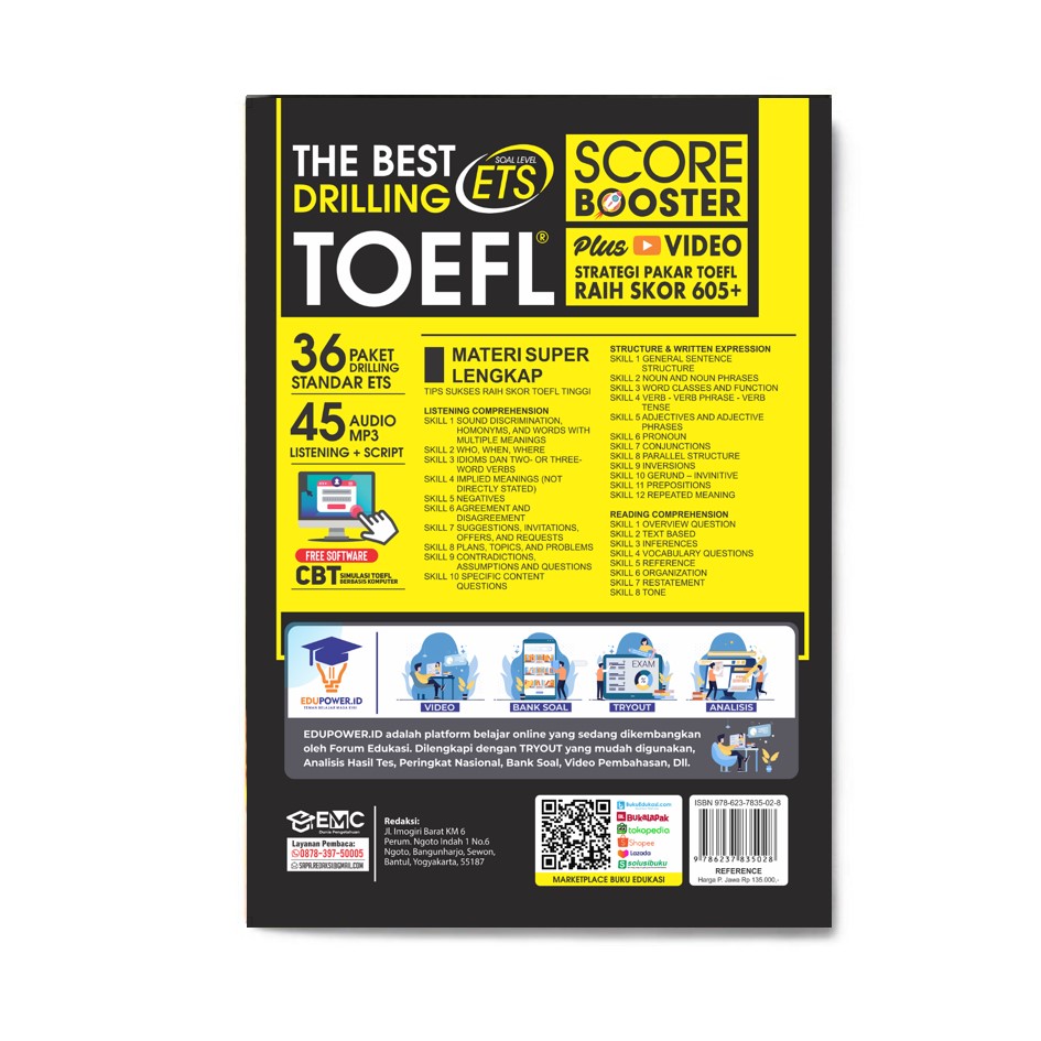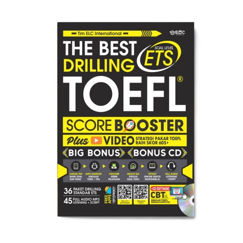Buku ini berisi 36 paket drilling TOEFL standar ETS dan 45 Audio mp3 listening dan script. Dilengkapi dengan materi super lengkap tips sukses raih skor Toefl tertinggi. Plus Video strategi pakar Toefl raih skor 605+. Bonus: CD software CBT Simulasi Toefl berbasis Komputer, e-book bank soal siap print, Aplikasi Android simulasi Toefl dan TPA, Voucher Pelatihan 500rb, Grup diskusi soal Toefl, Tryout Online gratis, dan lain sebagainya.